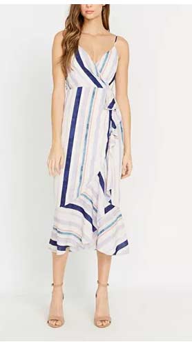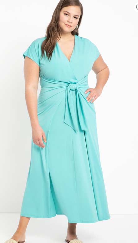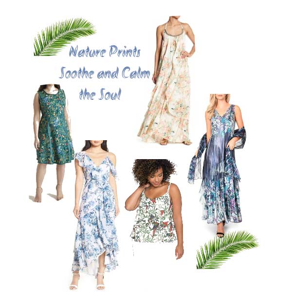 These prints create the illusion of a slimming figure through the use of color blocking and vertical designs.  A vertical block of color will draw the eye up making us appear taller and, in most cases, slimmer.  Add a vertical detail such as vertical stripes and the elongating effect is even stronger!  A solid band of color such as in this aqua dress can also create that slimming and elongating illusion.  If you are on the shorter side, add some heels in a similar color intensity to your hem or your skin tone to lengthen even more. Also notice, that the plus size maxi dress, although a nature print, causes the eye to look vertically up and down, based on how the print is aligned on the dress. This also causes a visually slimming effect. Shop these styles and see my notes on the slimming/elongating effects.