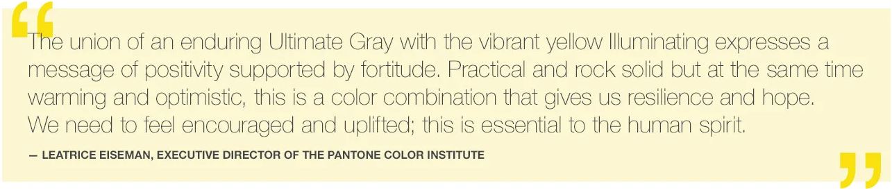 Every year Pantone selects a color of the year after combing the world for color influences in film, the art and design communities, travel, lifestyles, and socio-economic conditions. Considering this, a selection of two colors makes sense. Pantone describes the color combination as “A marriage of color conveying strength and hopefulness that is both enduring and uplifting.” The colors are described as a combination of elements that come together to support one another. Ultimate Gray being practical and rock-solid, while Illuminating expresses thoughtfulness with the promise of something sunny and friendly. They are spot on with these colors as we need stability as well as optimism as we look to the future.