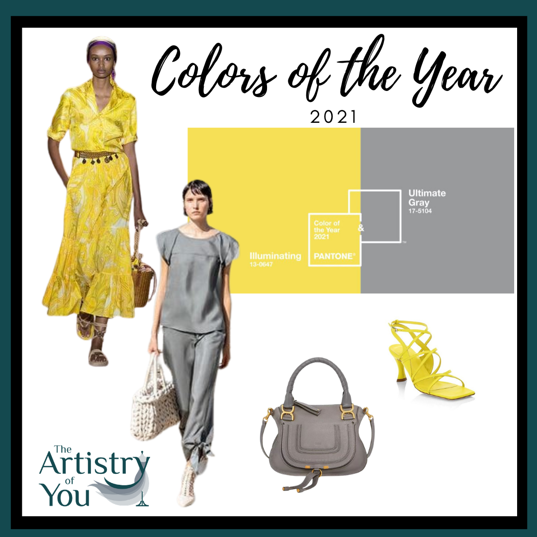 Each year my clients ask, “How does Pantone pick the color of the year?” and “How do I wear Pantone’s color of the year?”. Let’s look. The Pantone 2021 color of the year is actually two colors: Illuminating, a bright and warm yellow, and Ultimate Gray, a practical, medium-light gray. Why two colors instead of one? The Pantone color experts really don’t really give an answer, but let’s face it…2020 wasn’t normal, so why would Pantone’s 2021 color of the year be?