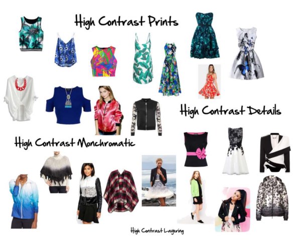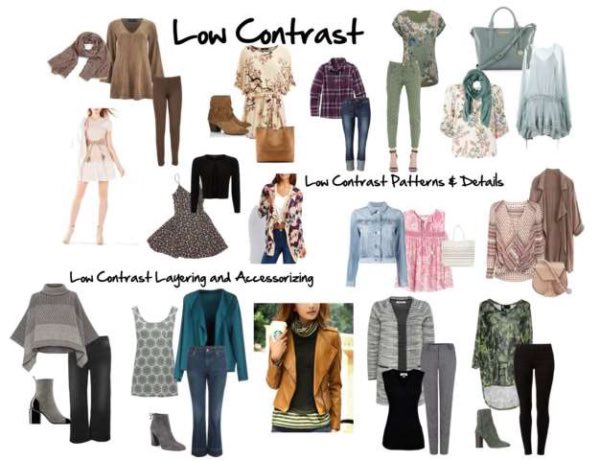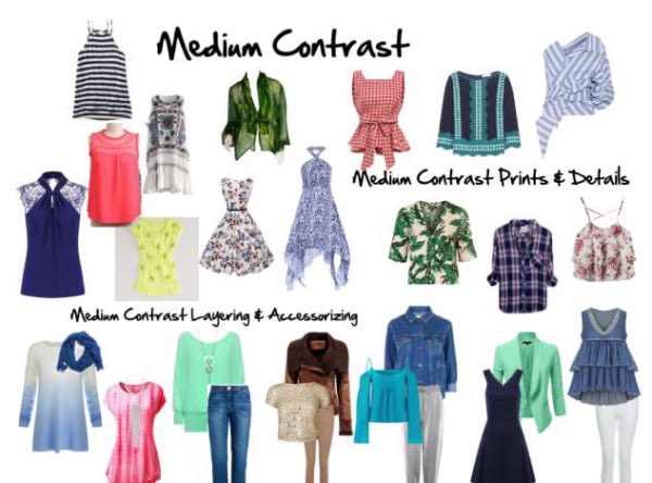 So we already know how important wearing the best colors is….so what is contrast? Simply put, contrast is the difference in intensity between colors. Some of us look good in high contrast (a large difference between colors such as black and bright fuchsia, or light and dark), some in medium contrast (such as navy and ivory) and some rock a low contrast or little difference between colors, (such as medium pink paired with pastel pink). The easiest way to show this is with pictures. Remember, contrast can occur when layering garments or just the color contrast between a top and your skin tone. It also occurs in patterns and even between a top and scarf or necklace.